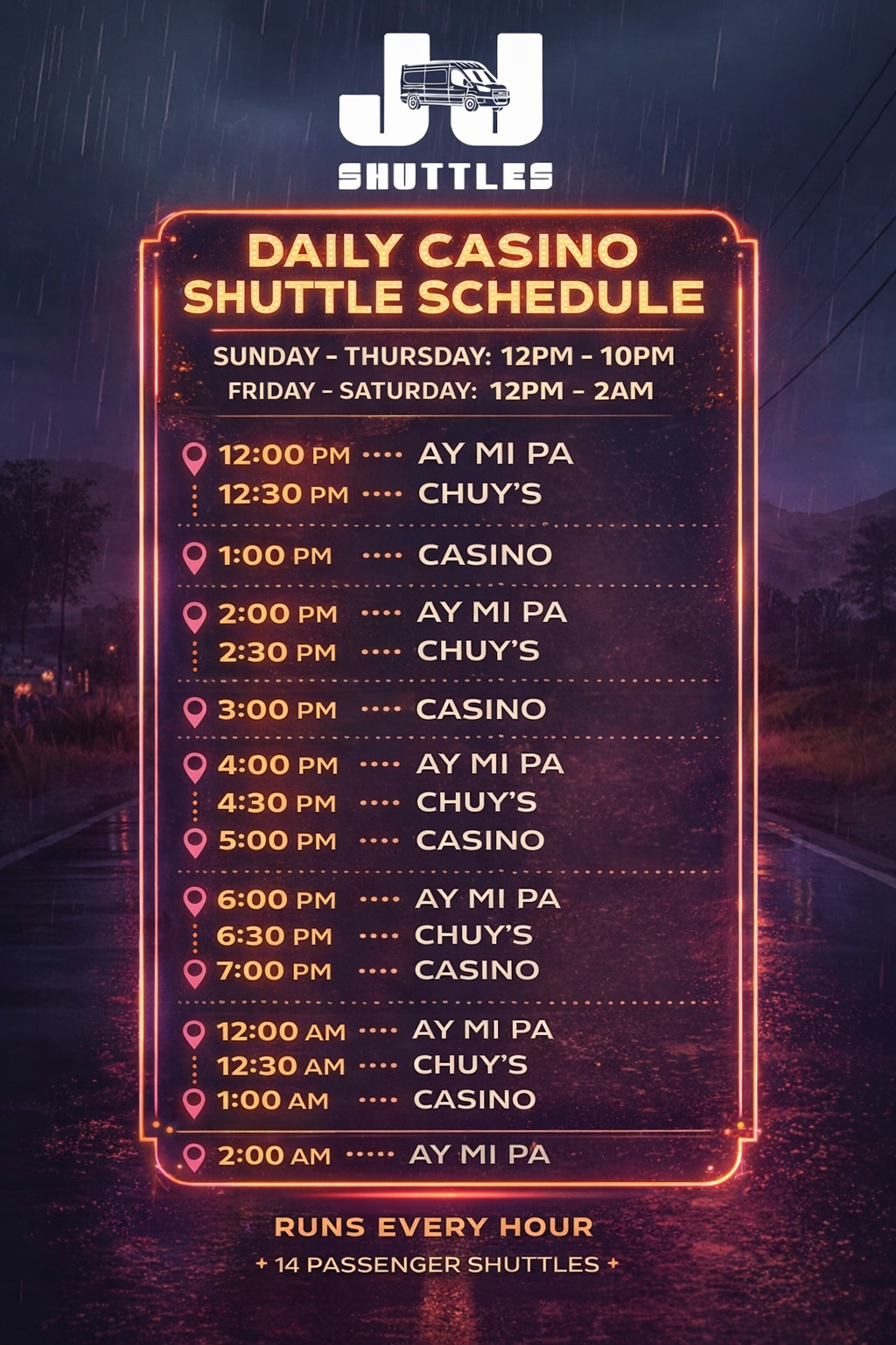 Pick up at Ay Mi Pa and Chuys drop off at Hard rock Tejon! returning every other hour. Only $10 if you catch one of our monthly specials!